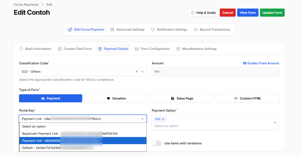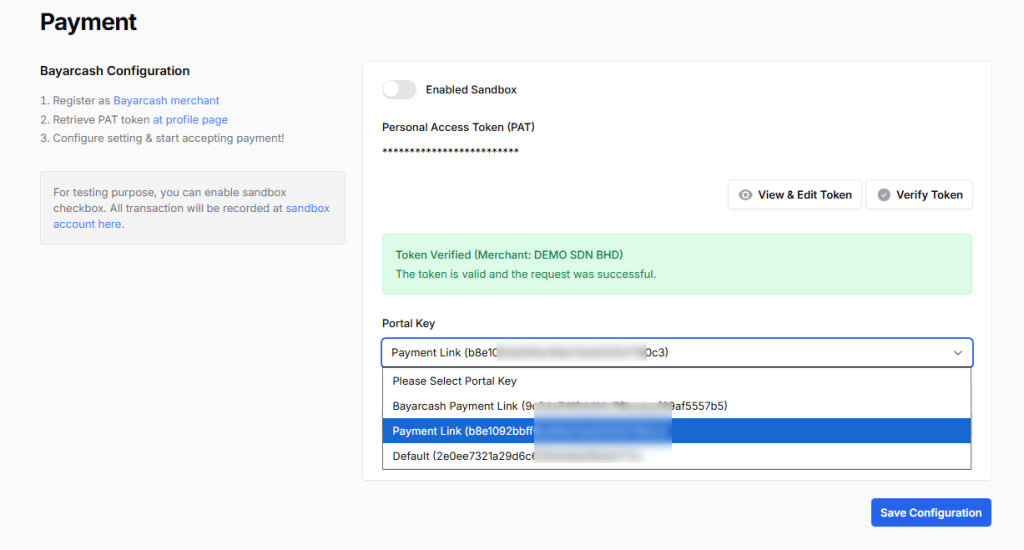 Penggunaan Portal Key Bayarcash di BCL boleh disetkan pada