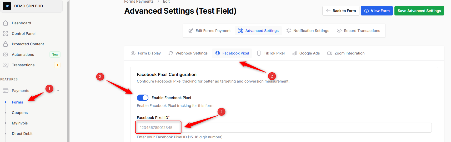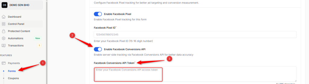 Pergi ke bcl.my semula -> Enable Facebook Conversions API -> Paste Token -> Update Form