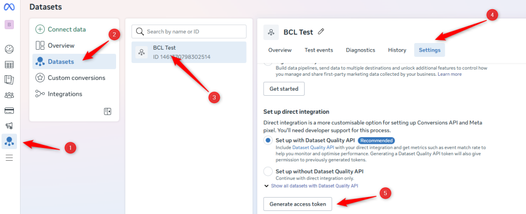 Pergi ke Event Manager -> Datasets -> Settings -> Generate Access Token -> Copy.