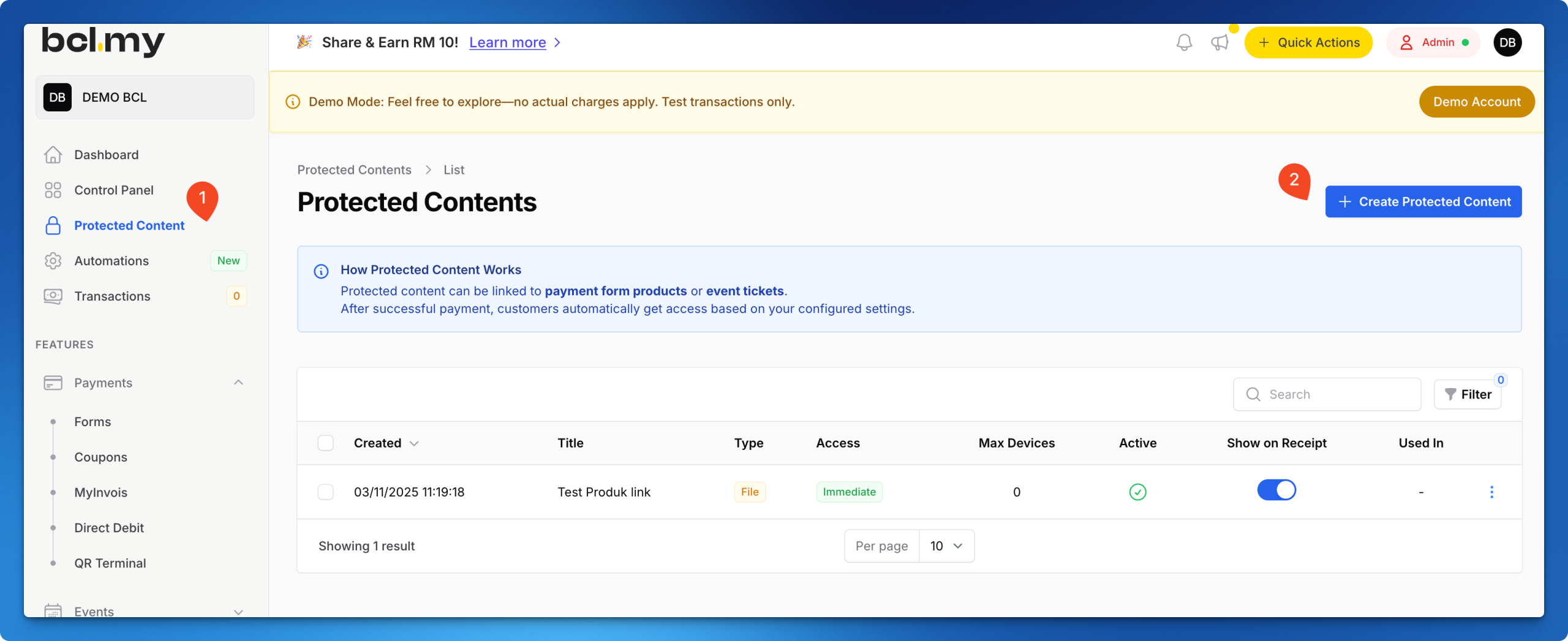 Seterusnya, pergi ke menu “Protected Content” dan klik “Create Protected Content” untuk mula menambah produk digital yang ingin dijual.