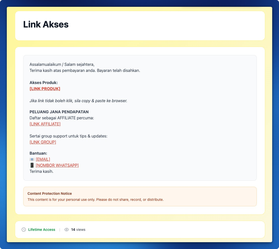 Pada halaman Resit (Receipt Page) selepas pembeli berjaya membuat pembayaran, akan dipaparkan butang “View Protected Content”.