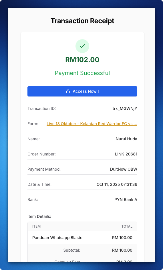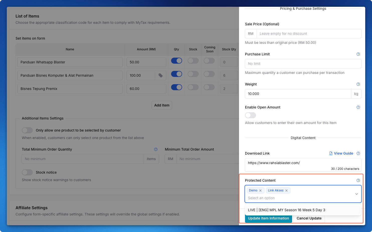 Apabila pelanggan membuat bayaran untuk item tersebut, mereka akan menerima akses automatik kepada Protected Content yang dikaitkan.